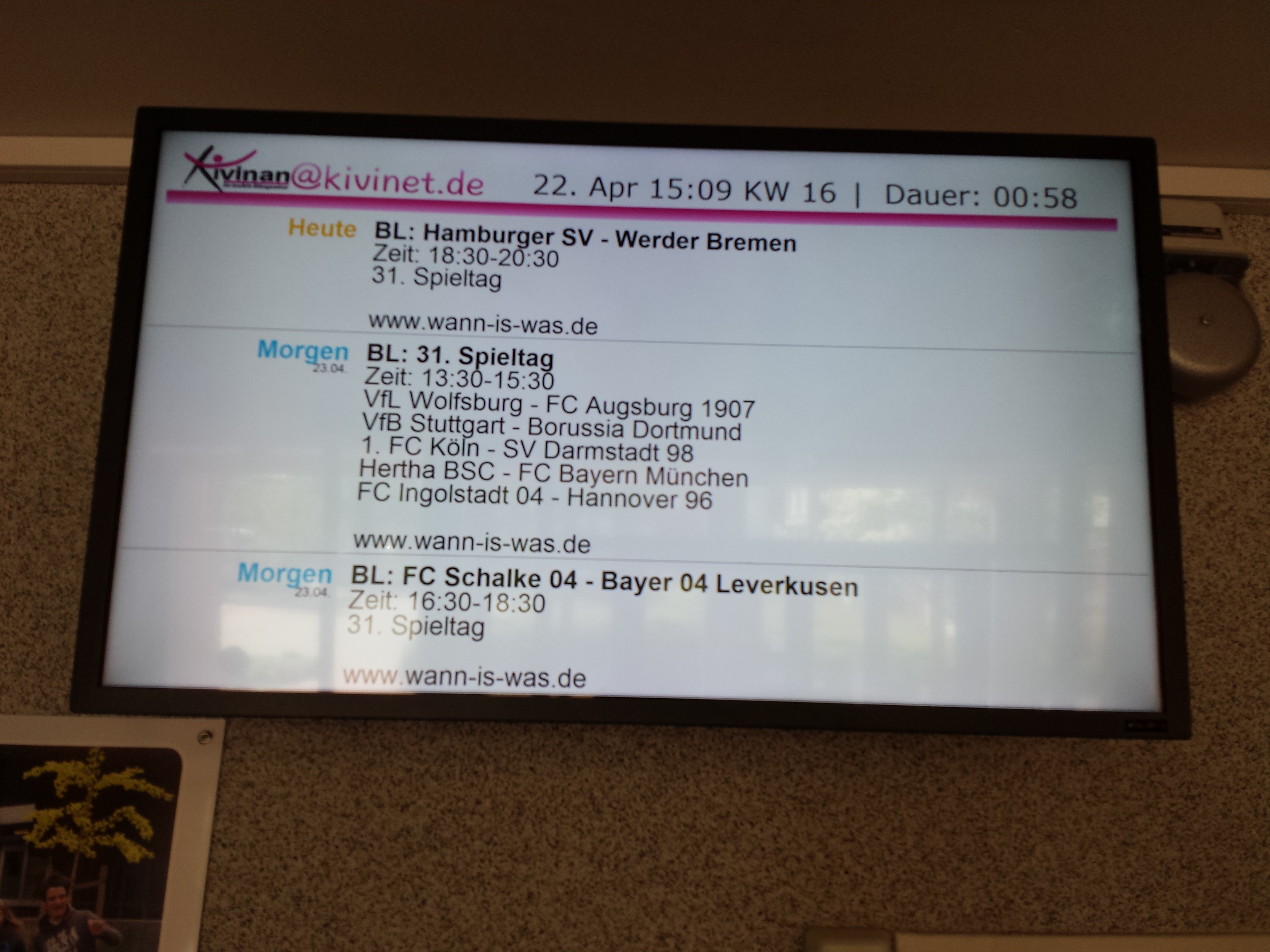 Schulen sollten Informationssysteme nutzen, um die Schüler rechtzeitig und zeitgemäß über Vertretungen und sonstige aktuelle Ereignisse in der Schule zu informieren Im Folgenden soll gezeigt werden, wie man einen schulweiten Terminkalender und einen scrollenden Lauftext auf Infoschirme bringen kann. Der Input erfolgt über eine iCal-URL, die man z.B. mit einem ILIAS-Kalender erzeugen kann. Unten finden Sie entsprechende Screenshots.
