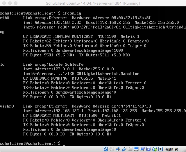 Wir loggen uns über die Konsole von VirtualBox direkt ein mit dem User/Passwort schulclient: