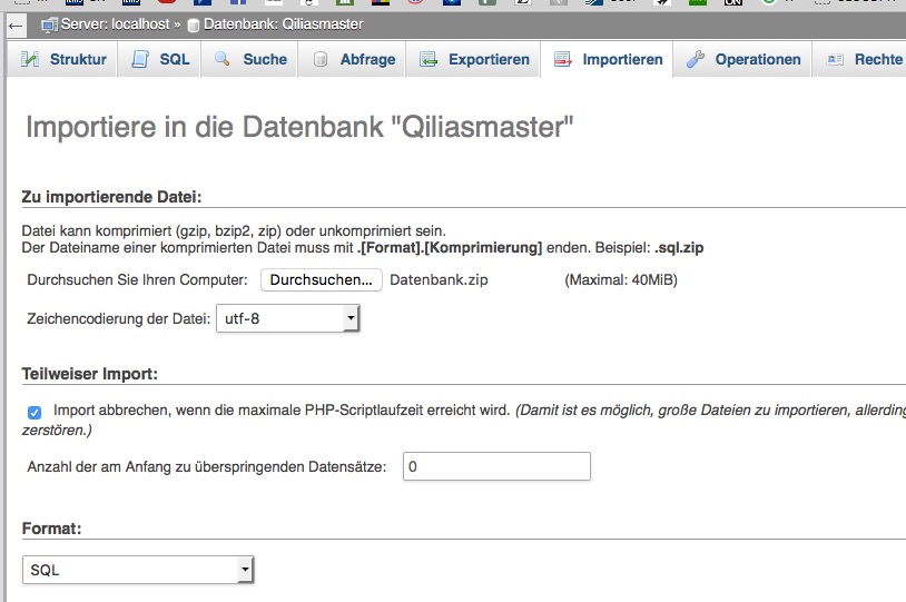 Wir rufen diese Datenbank auf und importieren unsere Datei Datenbank.zip: