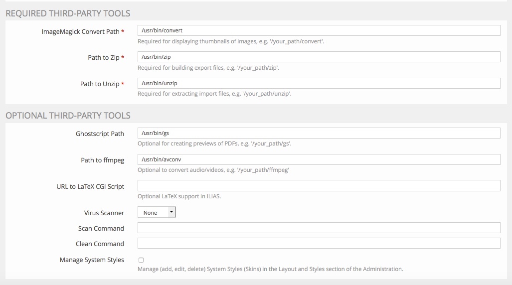 • To avoid open basdir restriction problems, put in the PHP settings page under openbasedir something like this: {WEBSPACEROOT}{/}{:}{TMP}{/}:/opt/ilias