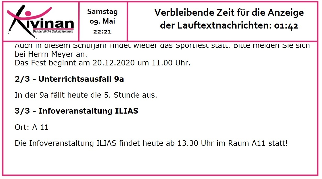 Schulen sollten Informationssysteme nutzen, um die Schüler rechtzeitig und zeitgemäß über Vertretungen und sonstige aktuelle Ereignisse in der Schule zu informieren Im Folgenden soll gezeigt werden, wie man einen schulweiten Terminkalender und einen scrollenden Lauftext auf Infoschirme bringen kann. Der Input erfolgt über eine iCal-URL, die man z.B. mit einem ILIAS-Kalender erzeugen kann. Unten finden Sie entsprechende Screenshots.