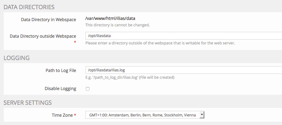 Für die Installation von ILIAS benügen wir 2 Verzeichnisse. Zum einen ist dies das Verzeichnis im Webspace /var/www/html/ilias und zum anderen das Verzeichnis außerhalb des Webspaces /opt/ilias. Letzteres legen wir nun an:mkdir /opt/iliasdatamkdir /opt/iliasdata/lucene