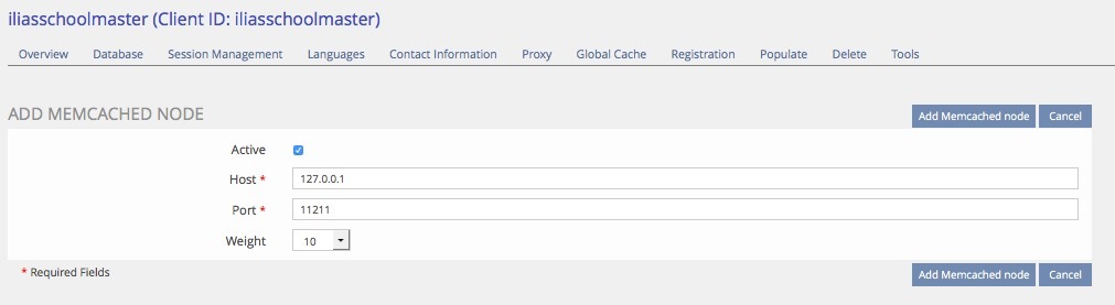 Im ILIAS-Setup können wir für die Mandanten Memcache in den Client-Details unter "Global Cache" aktivieren. Die Memcache-Node setzen wir wie folgt (Host: 127.0.0.1 - Port: 11211):